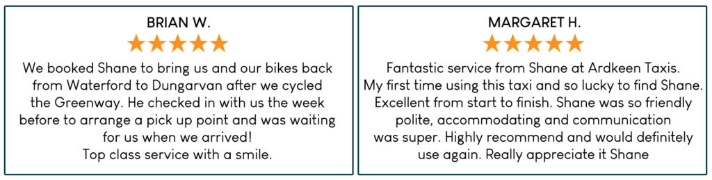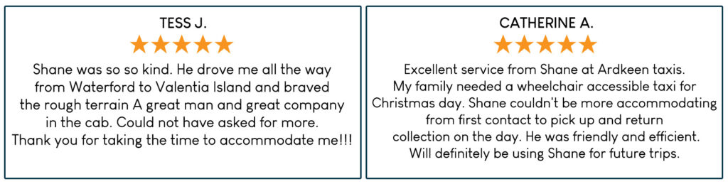 A family run Waterford taxi service business, we know that looking after each and every passenger is what makes us special. Our goal is to always provide a 5 star taxi and minibus hire service so you will want to recommend us to all your friends and family.